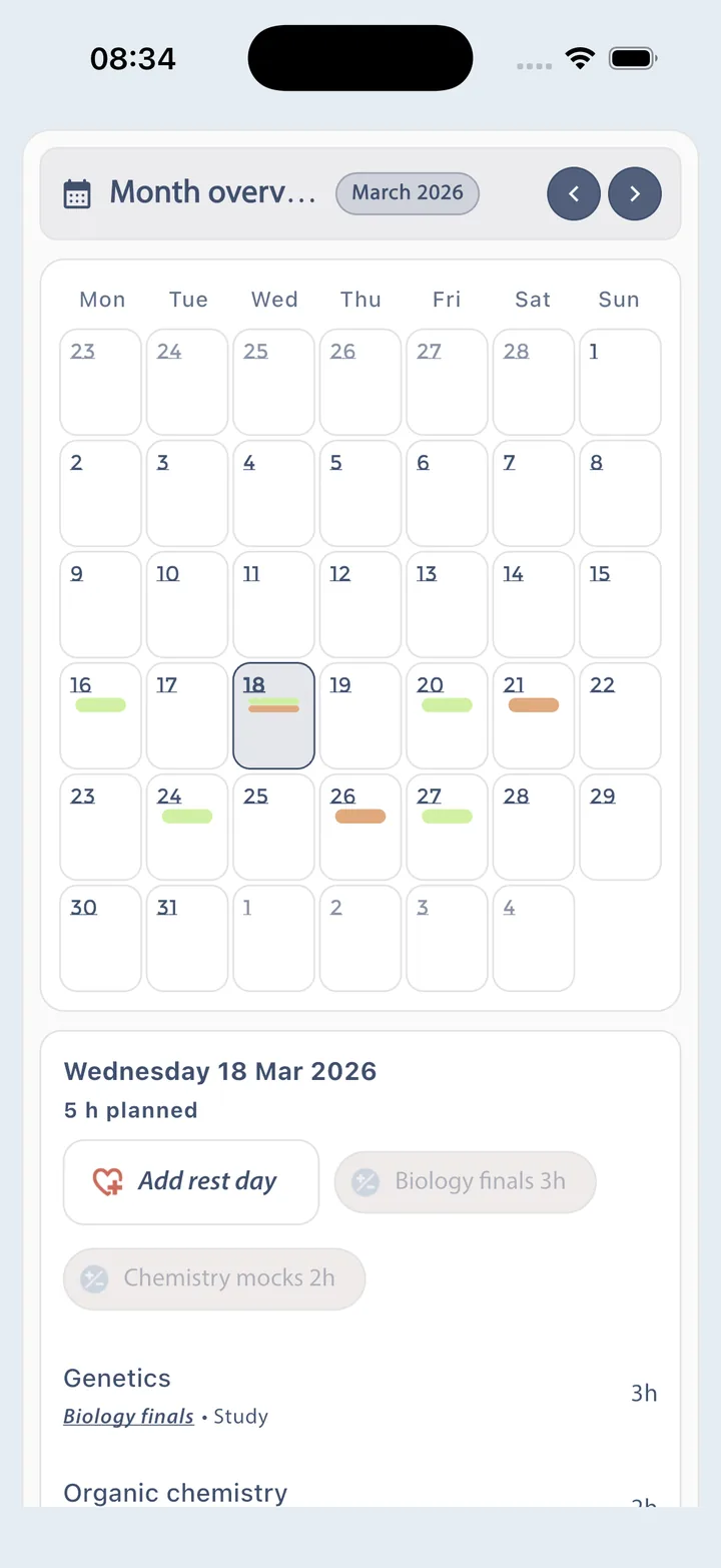 Add your exams, set dates, create topics, assign topic weightings, and define the study hours you realistically have each week.